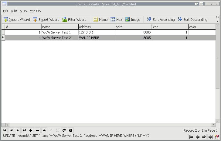 Thats what your sql realmlist should look like. Of course where it says WAN IP HERE you should edit it to show yours.