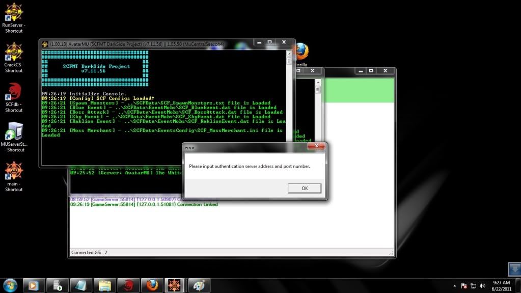 Hello. I have a problem with connecting to my server. I turn ON MUServerStartUP.exe. When all is READY I turn ON SCFdb3.exe. I open MainCracker.exe and open main.exe via it. I enter my global IP there. Then I try to connect to server with clicking on main.exe. (There were some errors with "glow.gld", "ODBC", but I somehow have fixed it.) When game is loading (On the screen is red written WEBZEN) it's just turns OFF.