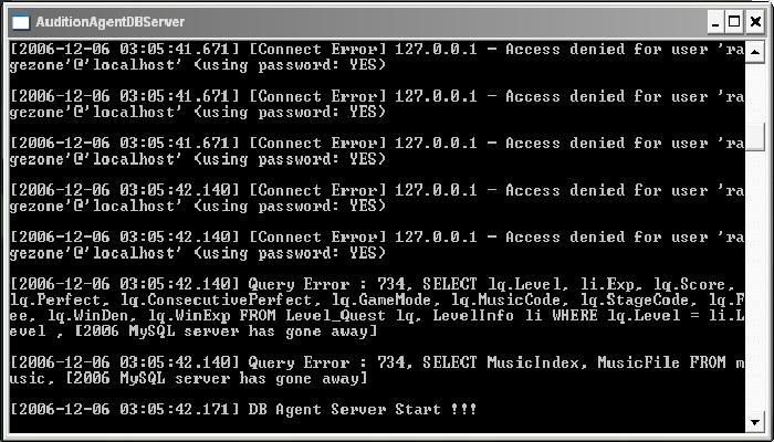 [03:05:42.171][Audition GameDBAgentServer] Started!! [2006-12-06 03:05:42.171] [03:05:42.171]