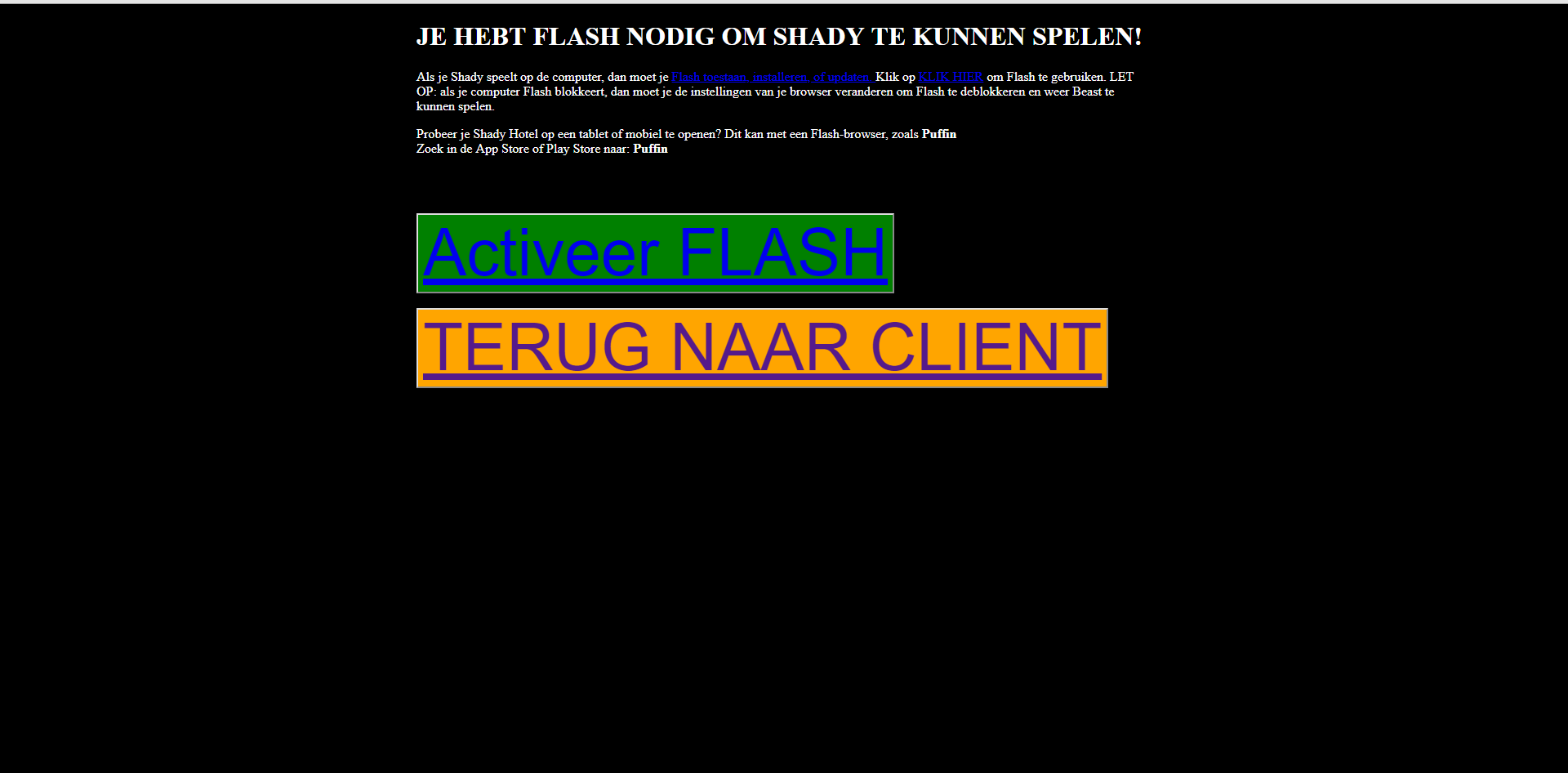 </body><head> <meta http-equiv="Content-Type" content="text/html; charset=utf-8"/> <title><?= $config['hotelName'] ?> - Game</title> <script src="/templates/brain/client/js/jquery-latest.js" type="text/javascript"></script> <script src="/templates/brain/client/js/jquery-ui.js" type="text/javascript"></script> <script src="/templates/brain/client/js/flashclient.js"></script> <script src="/templates/brain/client/js/flash_detect_min.js"></script> </head><body style="background-color: black; color: white"></div></div><div style><div id="flash-wrapper"><div id="flash-container"><div id="content" style="width: 900px; margin: 20px auto 0 auto;display: none"><div class="client-error"><h1 class="client-error__title" translate="client_error_title">JE HEBT FLASH NODIG OM SHADY TE KUNNEN SPELEN!</h1><p translate="CLIENT_ERROR_FLASH">Als je Shady speelt op de computer, dan moet je <a href="https://www.adobe.com/go/getflashplayer" target="_blank">Flash toestaan, installeren, of updaten. </a> Klik op <a href="https://www.adobe.com/go/getflashplayer" target="_blank">KLIK HIER</a> om Flash te gebruiken. LET OP: als je computer Flash blokkeert, dan moet je de instellingen van je browser veranderen om Flash te deblokkeren en weer Beast te kunnen spelen.</p><div class="client-error__downloads"><a class="client-error__flash" href="https://www.adobe.com/go/getflashplayer" rel="http://shadyhotel.nl/client" target="_blank"></a></div><p translate="CLIENT_ERROR_MOBILE">Probeer je Shady Hotel op een tablet of mobiel te openen? Dit kan met een Flash-browser, zoals <b>Puffin</b><br>Zoek in de App Store of Play Store naar: <b>Puffin</b></p><br /><br /><br /><button style="background-color: green"><a href="https://www.adobe.com/go/getflashplayer" style="font-size: 80px;">Activeer FLASH</a></button> <br /> <br /> <button style="background-color: orange"><a href="/client" style="font-size: 80px;">TERUG NAAR CLIENT</a></button> <br /></div></div><script type="text/javascript"> $('#content').show(); </script></div></div></div>