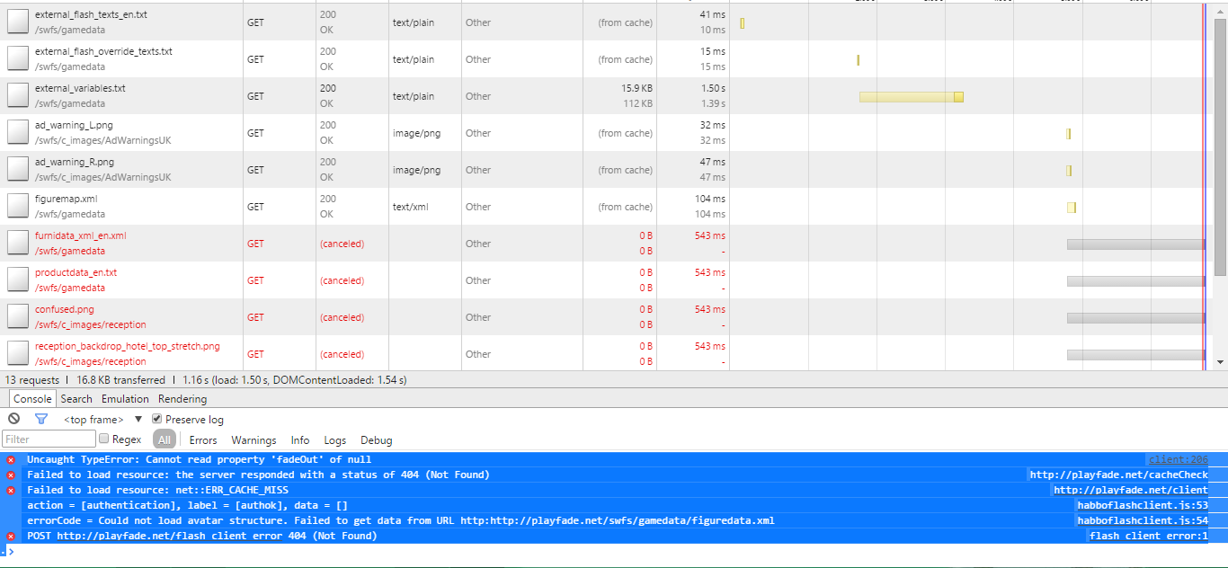 Emulator says this: [UserMgr] [Username] got disconnected. I have tried doing a OS refresh and redo what I did to setup to check if I made a mistake somewhere that I could catch. I also tried a lot of variables and swf packs. Not sure whats going on. Also I have a proxy. If you want the link its http://playfade.net