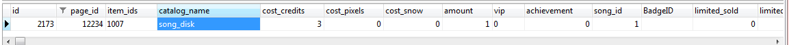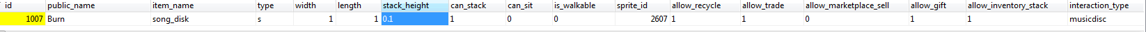 I have a problem with my song_disk/jukebox. i have added the interaction for jukebox which is jukebox and added the song_disk and set the song_id to 1 and sprite id to 2607 and interaction to musicdisc. but still i can not use the disk in the jukebox. i'm buying the cds and put down a jukebox but it aint showing up the disk in the jukebox. anyone have any ideas?..