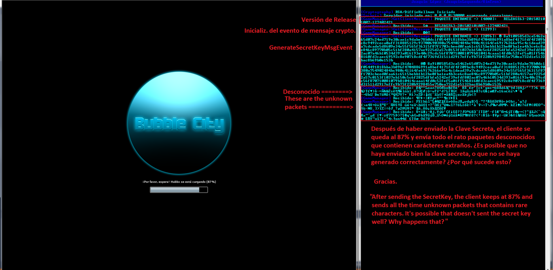 After sending the SecretKey, the client keeps at 87% and sends all the time unknown packets that contains rare characters. It's possible that doesn't sent the secret key well? Why happens that?