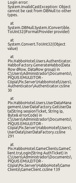 at Pix.HabboHotel.Users.Authenticator.HabboFactory.GenerateHabbo(DataRow dRow, DataRow group) in C:\Users\Administrador\Documents\PÍQUIS EMULEITOR - Cópia\Pix.Server\HabboHotel\Users\Authenticator\Authenticator.cs:line 30