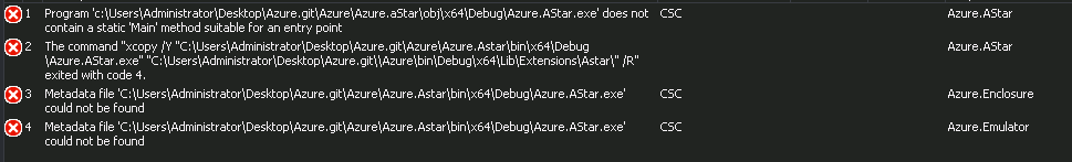 Error The command "xcopy /Y "C:\Users\Administrator\Desktop\Azure.git\Azure\Azure.Astar\bin\x64\Debug\Azure.AStar.exe" "C:\Users\Administrator\Desktop\Azure.git\\Azure\bin\Debug\x64\Lib\Extensions\Astar\" /R" exited with code 4. Azure.AStar