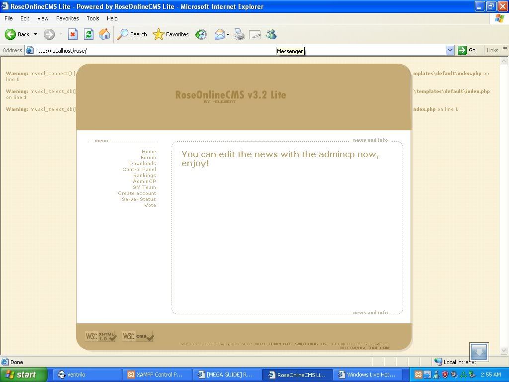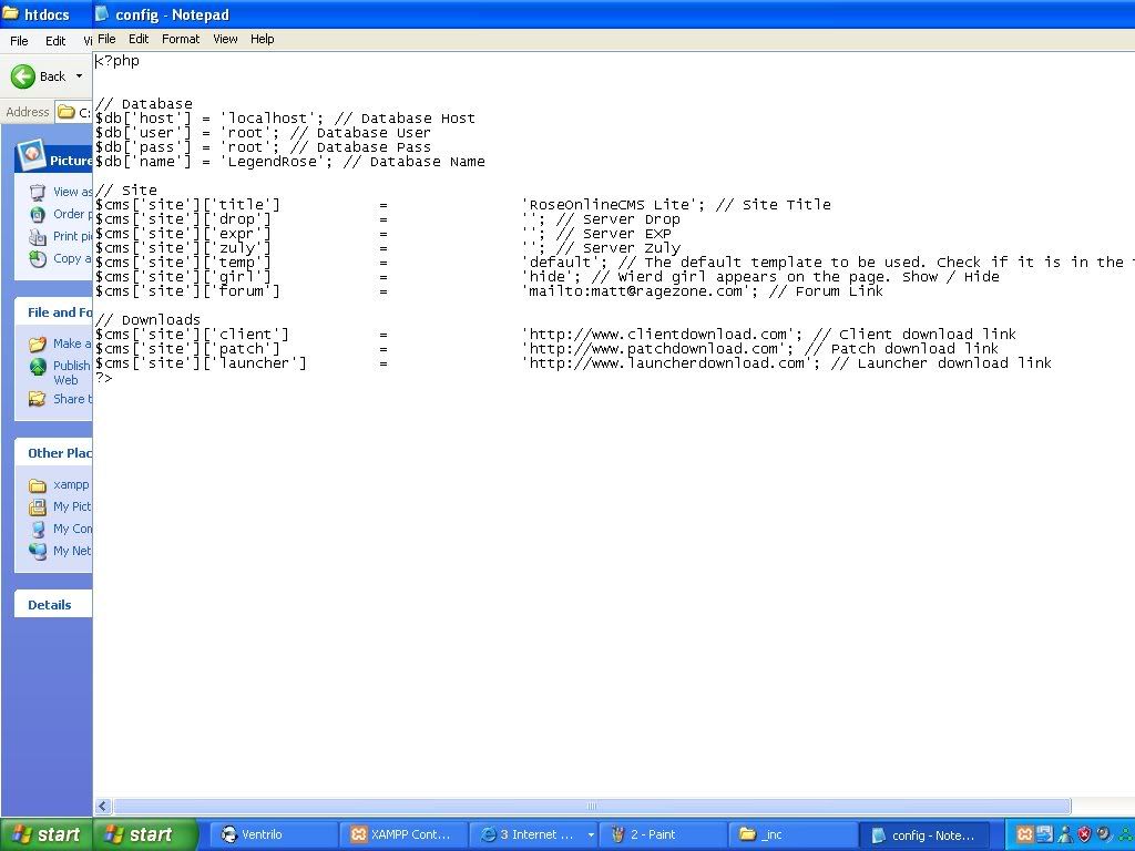 Next, go to your HTDOCS folder, which is found in the Xampp folder. (Default path is C:\xampp\htdocs ). Delete all the files inside the HTDOCS folder except for the folders "forbidden" and "restricted", please leave those. Then extract the Rose CMS v3.2 Lite you just downloaded to the HTDOCS folder. After you have extracted it, make sure xamp_start.exe is running, if not go back to your xampp root folder ( C:\xampp) and start it. If the webserver is running, bring your web browser up and type "http://localhost" and you should see your Rose CMS v3.2 Lite! Now you need to install the website to make it connect to your database (so you can make accounts). So in your "inc" folder, find the file named "config.php" and edit the Database settings inside there. So follow this pattern:
