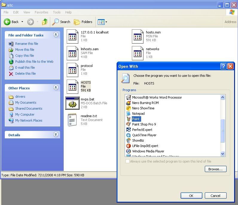 -Right click on HOSTS and say OPEN, open the file with notepad or wordpad.