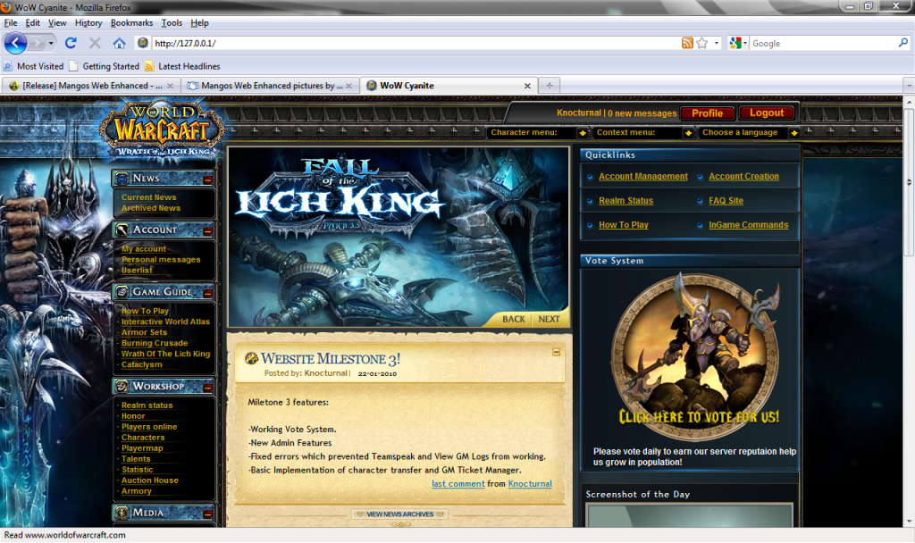 MangosWeb Enhanced is a project to update and fix problems with the older Mangos Web. It includes a main site with a donation system, full admin panel, a forum, and full multirealm support with full support for 3.3.2a. Also includes a 3.2.2a Armory.