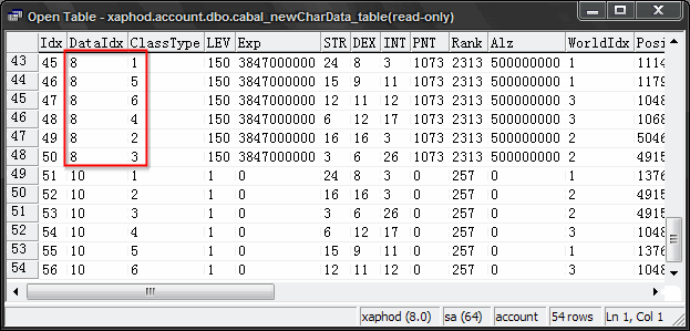 This table (cabal_newchardata_table for those that can't read title bars) holds the default stats, alz, mapcodes and a whole bunch of other stuff that gets used for new chars. Inventory, equips, quest data and some other stuff can be found in cabal_newetcdata. We have just told the server to use set 8 which you can see are not noobie stats, it was using 10 before just below the area i hilighted which are the normal new char stats.