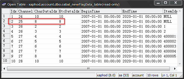 All very interesting, but why does it do that? To find out you need to look at some other tables in the account database...Code:update cabal_newflagdata_table set chardataidx=8, etcdataidx=8 where channel=25