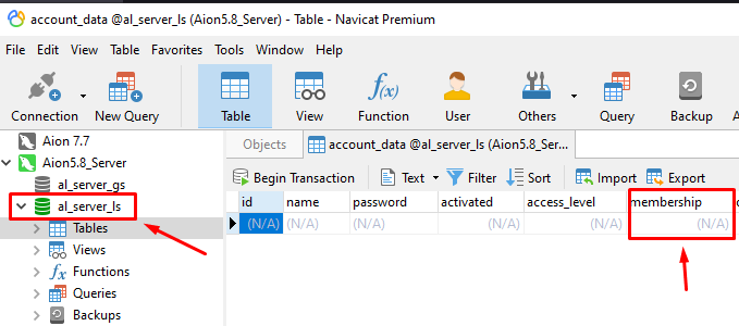 Also from navicat, right clic on account_data > design table > membership and edit the default value 0 to 1 or 2 then save