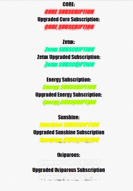 Code:CORE:<br> <span style="color: green;text-shadow: 0px 0px 5px #FF1B85;"><strong><em><font color="#FF1B85">CORE SUBSCRIPTION</font></b></span></em></strong><br> Upgraded Core Subscription:<br> <span style="color: green;text-shadow: 0px 0px 5px #FF1B85;"><strong><em><span style="background: url(uploads/images/backround4.gif)"><b><font color="#FF1B85">CORE SUBSCRIPTION</font></b></span></em></strong></span><br> <br> Zetux:<br> <span style="color: green;text-shadow: 0px 0px 5px #00FFAE;"><strong><em><font color="#00FFAE">Zetux SUBSCRIPTION</font></b></span></em></strong><br> Zetux Upgraded Subscription:<br> <span style="color: green;text-shadow: 0px 0px 5px #00FFAE;"><strong><em><span style="background: url(uploads/images/backround8.gif)"><b><font color="#00FFAE">Zetux SUBSCRIPTION</font></b></span></em></strong></span><br> <br> Energy Subscription:<br> <span style="color: green;text-shadow: 0px 0px 5px #B3FF00;"><strong><em><font color="#B3FF00">Energy SUBSCRIPTION</font></b></span></em></strong><br> Upgraded Energy Subscription:<br> <span style="color: green;text-shadow: 0px 0px 5px #B3FF00;"><strong><em><span style="background: url(uploads/images/backround9.gif)"><b><font color="#B3FF00">Energy SUBSCRIPTION</font></b></span></em></strong></span><br> <br> Sunshine:<br> <span style="color: green;text-shadow: 0px 0px 5px #FCFF00;"><strong><em><font color="#FCFF00">Sunshine SUBSCRIPTION</font></b></span></em></strong><br> Upgraded Sunshine Subscription<br> <span style="color: green;text-shadow: 0px 0px 5px #FCFF00;"><strong><em><span style="background: url(uploads/images/backround18.gif)"><b><font color="#FCFF00">Sunshine SUBSCRIPTION</font></b></span></em></strong></span><br> <br> Oviparous:<br> <span style="color: green;text-shadow: 0px 0px 5px #D6D6D6;"><strong><em><font color="#FFFFFF">Oviparous SUBSCRIPTION</font></b></span></em></strong><br> Upgraded Oviparous Subscription<br> <span style="color: green;text-shadow: 0px 0px 5px #D6D6D6;"><strong><em><span style="background: url(uploads/images/backround13.gif)"><b><font color="#FFFFFF">Oviparous SUBSCRIPTION</font></b></span></em></strong></span><br>