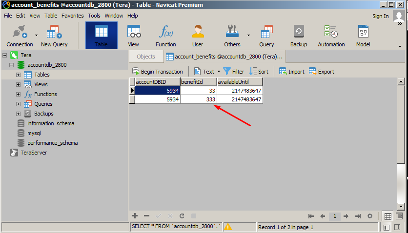 In the new table account_benefit, set the "accountDBID" to yours found in the "accountinfo" table, "benefitId" with your wanted benefit from the list or datacenter file and "availableUntil" to the date you want this benefit to be available (set the date in 10 years if you want it permanently).Code:<String id="31" string="Proof of the expedition member" /> <String id="32" string="Skillful Adventurer" /> <String id="33" string="TERA Rewards" showLeftTimeOver1Year="False" /> <String id="34" string="Frontier" hideCoolTime="True" /> <String id="35" string="EP XP increases by 30" hideCoolTime="True" /> <String id="70" string="" showLeftTimeOver1Year="False" /> <String id="77" string="Monthly Pass" showLeftTimeOver1Year="False" /> <String id="101" string="" showLeftTimeOver1Year="True" /> <String id="102" string="" hideCoolTime="True" /> <String id="103" string="Japan Returning user" /> <String id="104" string="JP Tooltip" showLeftTimeOver1Year="True" /> <String id="105" string="" showLeftTimeOver1Year="True" /> <String id="106" string="" showLeftTimeOver1Year="True" /> <String id="107" string="" showLeftTimeOver1Year="True" /> <String id="108" string="" showLeftTimeOver1Year="True" /> <String id="109" string="" showLeftTimeOver1Year="True" /> <String id="333" string="Elite Status" /> <String id="334" string="Founder" /> <String id="335" string="Console Elite" /> <String id="350" string="Server Benefit" /> <String id="433" string="TERA Club" /> <String id="434" string="Veteran" /> <String id="435" string="Package Benefit I" /> <String id="436" string="Package Benefit II" /> <String id="437" string="Package Benefit III" /> <String id="500" string="VIP" showLeftTimeOver1Year="False" /> <String id="510" string="TW XP Boost Server" /> <String id="520" string="VIP2" /> <String id="530" string="" showLeftTimeOver1Year="False" /> <String id="533" string="VIP" /> <String id="534" string="Founder" hideCoolTime="True" /> <String id="600" string="Trade restricted" hideCoolTime="True" /> <String id="601" string="Basic Package" hideCoolTime="True" /> <String id="691" string="Safe Mode" /> <String id="701" string="VIP" showLeftTimeOver1Year="False" /> <String id="800" string="PC Café (Minor)" /> <String id="801" string="PC Café (Intermediate)" /> <String id="802" string="PC Café (Major)" /> <String id="803" string="PC Café (VIP)" /> <String id="804" string="User ELITE (Minor)" /> <String id="805" string="User ELITE (Intermediate)" /> <String id="806" string="User ELITE (Major)" /> <String id="807" string="User ELITE (VIP)" /> <String id="808" string="" /> <String id="809" string="" showLeftTimeOver1Year="False" /> <String id="810" string="" showLeftTimeOver1Year="False" /> <String id="1000" string="TERA PC cafe" hideCoolTime="True" /> <String id="1001" string="" hideCoolTime="True" />