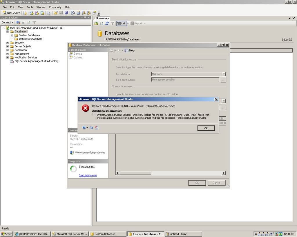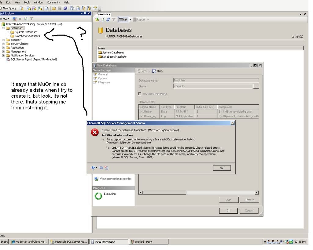 it does not mean its because its for sql 2000....sql 2005 is perfectly capable of opening 2000 db...you just to delete your muonline db and then restore it without having created it first...if you just take a normal install of sql 2005 and right click in the db area and choose restore you can set the name of the db to restore to, if it doesn't exists it will make it for you...do that and all will work ok