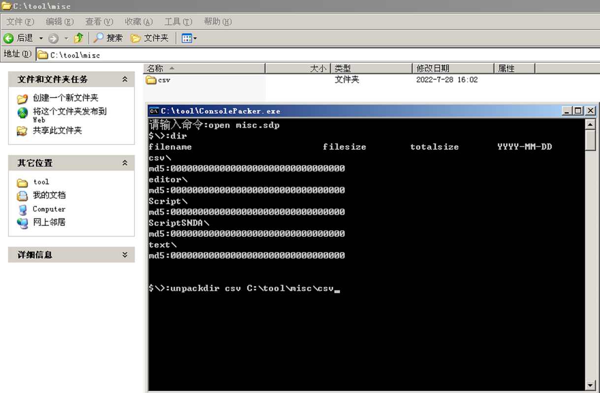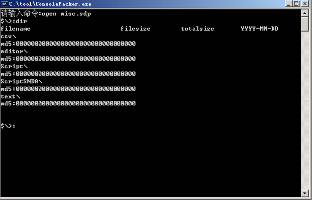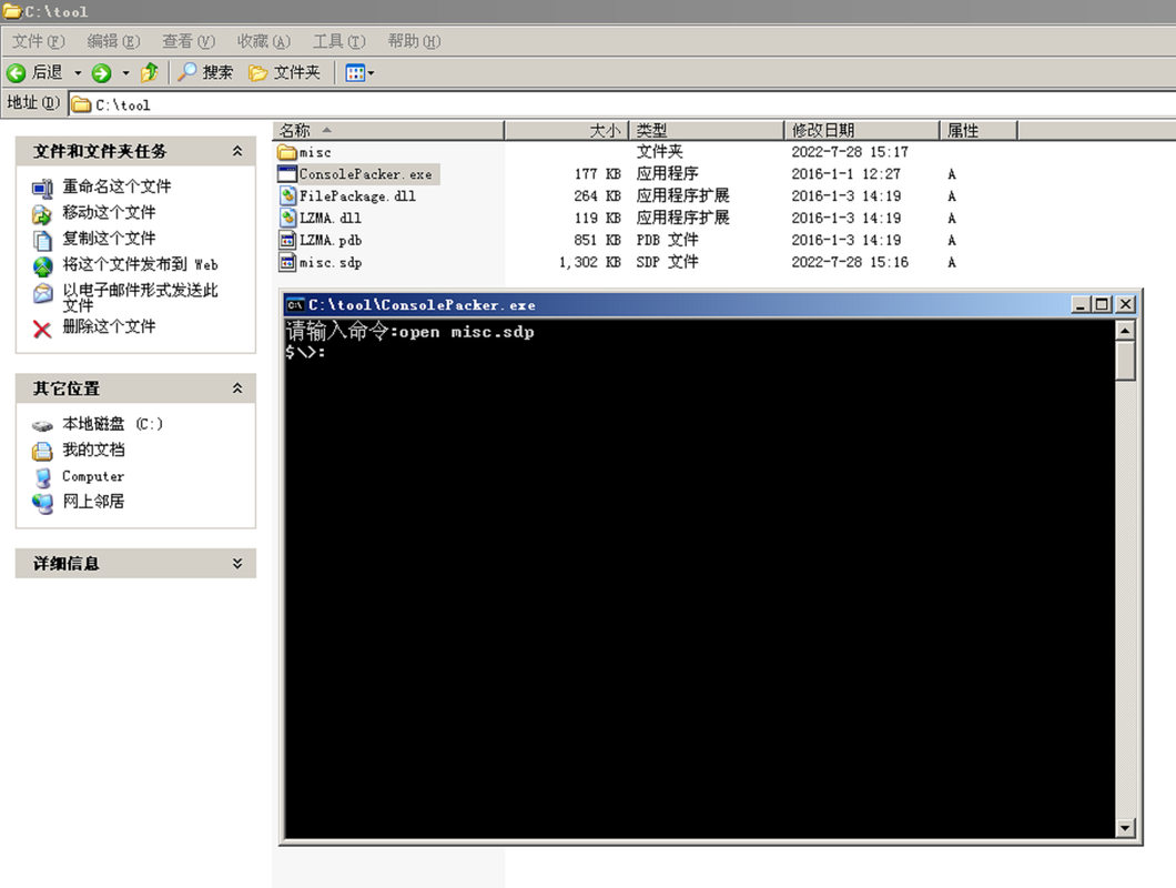 In this example, I'll open the "misc.sdp" Folder, list what's in it, extract some files and repack.