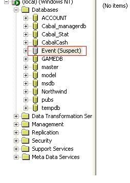 Its because mssql server stores database in *_Data.mdf file and db log in _Log.ldf, in fullServer there are Event_Log.ldf and just Evend.mdf, so server finds event database logs, and doesn't find actual data (infact it uses empty event database, wich u created) so imagine that server sees insert into character table in the log file, but doesn't see a character table in main database file, so its says it is suspected (corrupted) ;)