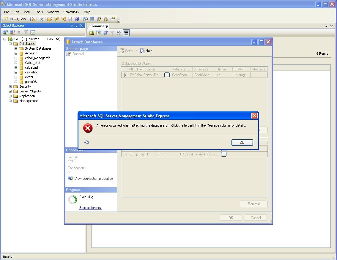 Here is a cashshop database backup file... just restore it, but first delete any batabase named cashshop that you may have from the Sql Management Studio