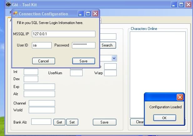why my tools say Configuration Loaded, that does not mean they are connected... they only connect to the database when you are making a call to the database, ie searching, or trying to load the cash shop and so on...