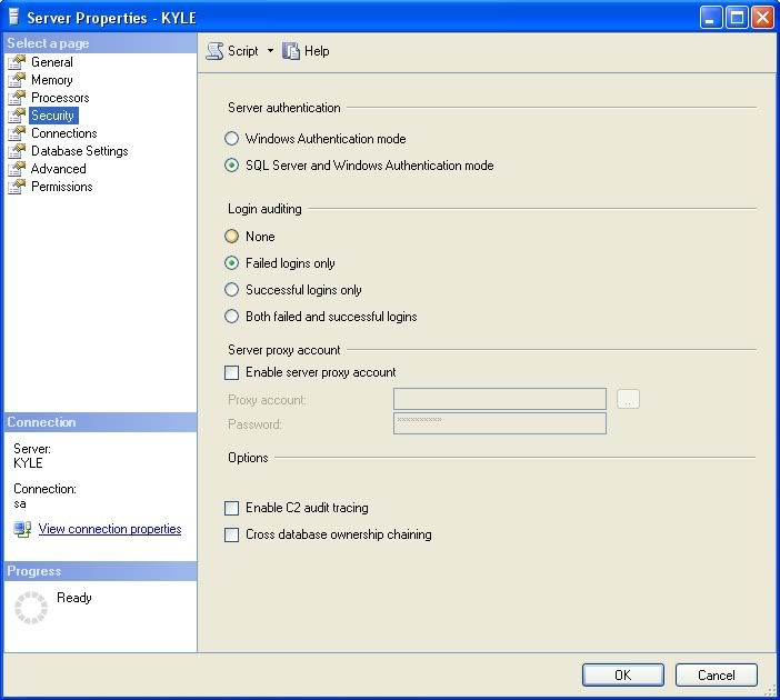 click security and the click the radio button for SQL Server and Windows Authentication,