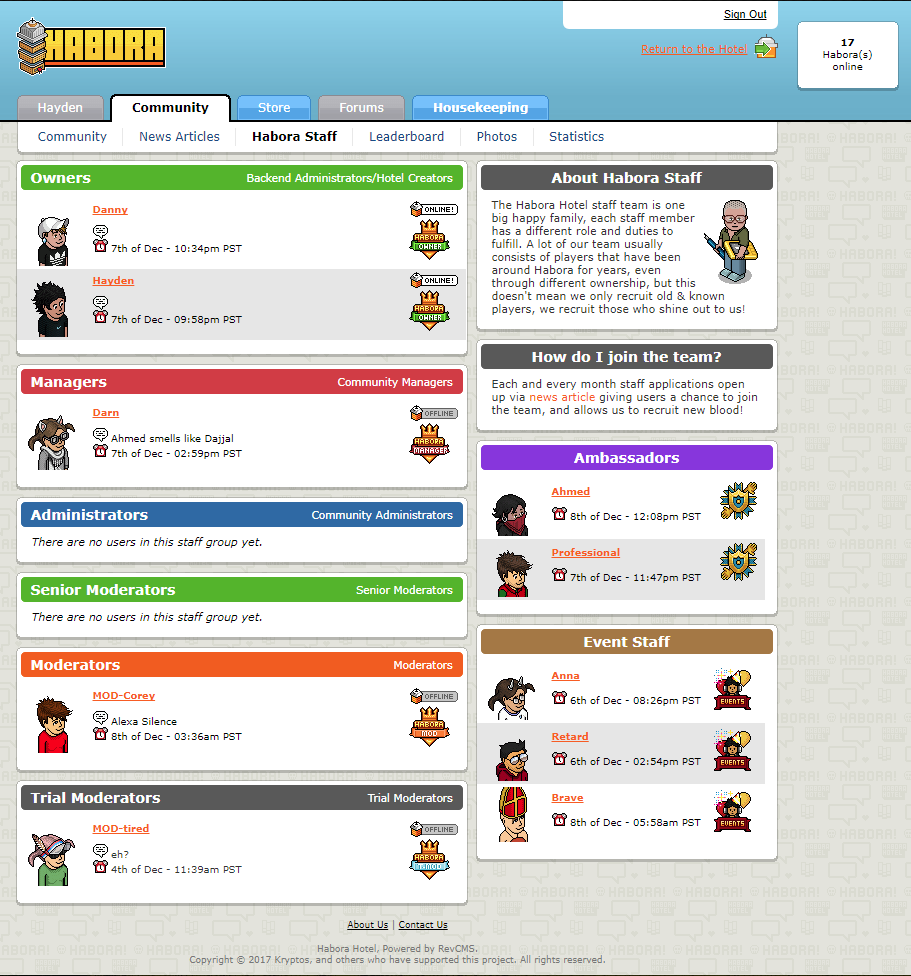 Here at Habora we believe in economy and equality. We take in all kinds of suggestions and users! You can always expect a mix of your favorite things and the old classic feel. While we strive on a strict community, we also want to allow you to build so we've set all furniture to cost duckets. With innovative event features, lots of in-game content and many incoming website features, not to mention an economy FULL of friendly and professional users waiting to meet you.. We're more than confident we can keep everyone content as Habora is home to some of the most versatile talents.