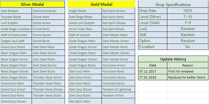 Gold Medal item drops are same with non-excellent Box of Kundun+5