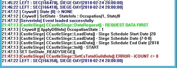 And in GSCS im getting this "[CastleSiege] CCastleSiege::SetCsTotalGuildInfo ERROR - iCOUNT <=0"
