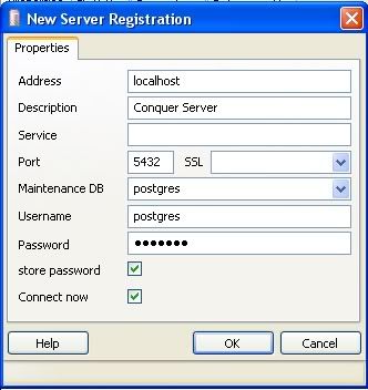 4. PostgreSql pgAdmin III -When Installing that you should have went through an account creation in the Installation. Then Create a Server. ( SEE IMAGE BELOW!) the username and password MUST be the same as the one in your Installation or you won't be able to connect.