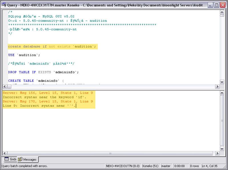 Install mysql 5.0 and mysqlcc with those 2 it should work to query because those sqls are version 5 of mysql so you would get an error if you try on version 4 unless it was backed up by navicat but its not