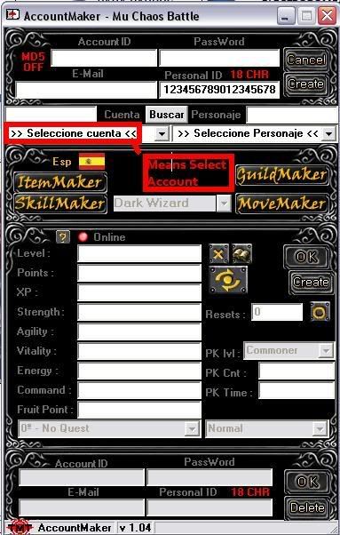 Photo of account error: The Account Had the name of >>Selecc Wich is really typed (in spanish) as Seleccionar that means select :D, that I found that that says it on MuMaker 1.05 On Image 2 (used to select an account =S). I deleted it. Mu maker error SHOULD be fixed.