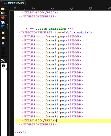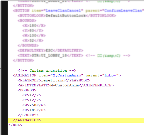 Inside the ANIMTEMPLATE tags, put the name of the animation you put on templates.xml. Remember, I named mine MyCustomAnim. If you read the beginning of this thread then you should know how to work with the X/Y & W/H values.